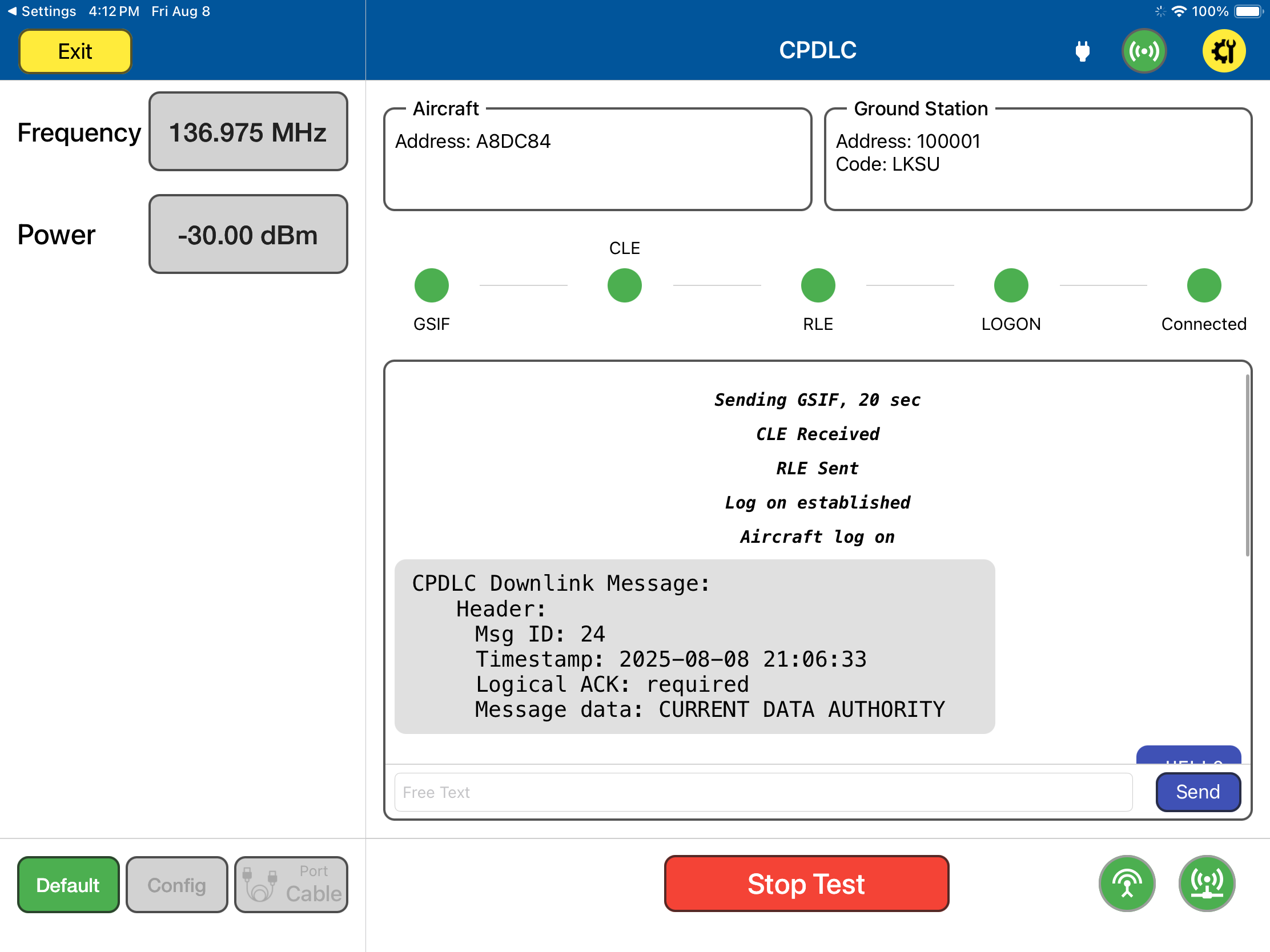 CPDLC is not a radio signal you can check with an RF parametric tester. It is a multi-layer digital communications protocol. Verifying it properly means emulating a complete VDL Mode 2 ATN ground station — generating the physical layer signal, advertising ATN support, completing a full CM logon with the aircraft’s CMU, exchanging uplink and downlink messages through the CDU/MCDU, and monitoring response timers — all from the hangar floor, with no external network connection required.